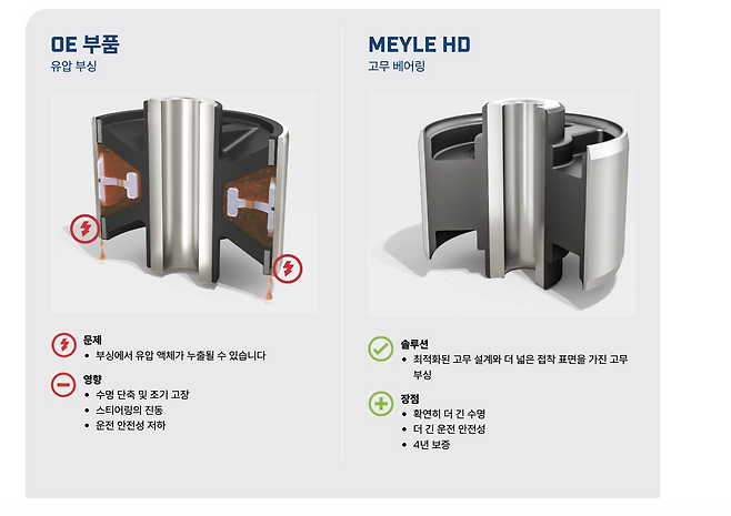 차량의 진동과 승차감에 직결되는 서스펜션 내 유압부싱은 보통 안팎이 약하게 맞물려 거친 노면을 지나는 등 단 한 번의 충격으로도 오일 누유가 발생할 수 있다. 마일레 HD 고무부싱은 특수 고무재질로 만들고 부싱 외부와 강하게 결합해 내구성을 높였다. 덕분에 고강도 주행 조건에서도 뛰어난 성능을 유지할 수 있다. 게다가 수십 년의 검증을 거쳤다.