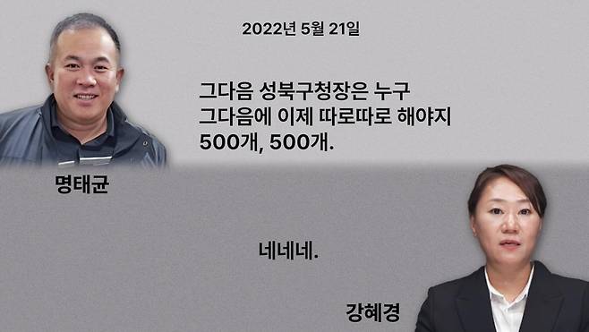 이어 명 씨는 "근데 첫 번째 질문이 서울시장. 그다음 성북구청장은 누구. 그다음에 이제 따로따로 해야지. 500개, 500개. 그다음에 중구 구청장은 누구. 그다음에 정당 지지. 오세훈 서울시장 거 물어보고, 중구 구청장 물어보고. 그다음에 이제 저거 아까 얘기했지만 정당 지지"라면서 조사 지역과 질문 순서까지 정해줬다.