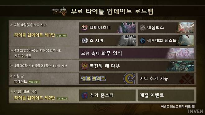 캡콤이 3월 25일 ‘몬스터헌터 와일즈’ 쇼케이스를 통해 타이틀 업데이트 제1탄의 상세 내용을 공개했다. 츠지모토 료조 프로듀서의 소개로 진행된 이번 발표에서는 4월 4일 배포될 첫 번째 무료 타이틀 업데이트의 핵심 콘텐츠가 다수 공개됐다.