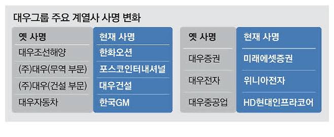 하지만 2010년대 들어 대우 간판을 떼어내는 기업들이 속속 생겼다. 제너럴모터스(GM)에 인수돼 GM대우로 사명이 바뀌었던 대우자동차는 2011년 한국GM으로 기업명이 교체됐다. (주)대우 무역 부문으로 세계 경영의 첨병 역할을 했던 대우인터내셔널은 2010년 포스코그룹에 인수된 이후 포스코대우로 대우 간판을 유지하다가 2019년 포스코인터내셔널이 됐다.