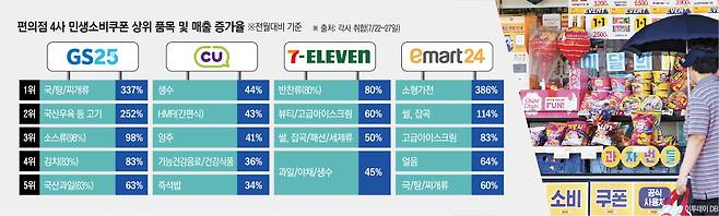 28일 소비쿠폰 최대 수혜처로 꼽히는 국내 편의점 4사에 따르면, 소비쿠폰이 지급된 첫 주(7월 21~27일) 식료품, 생활용품 등 전방위에 걸쳐 매출이 늘었다.