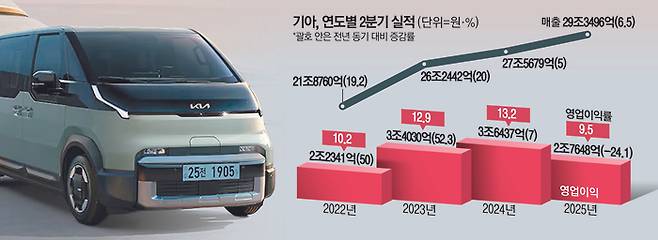 다만 기아는 매출 측면에선 역대 최고 기록을 썼다. 김승준 기아 재경본부장 전무는 이날 콘퍼런스콜에서 “신규 출시한 EV3의 호조와 하이브리드 차량 판매 증가로 올해 상반기 기아는 반기 기준 역대 최대 판매를 경신했다”고 밝혔다. 올해 2분기 글로벌 시장 판매량은 81만4888대로, 전년 동기 대비 2.5% 증가했다.