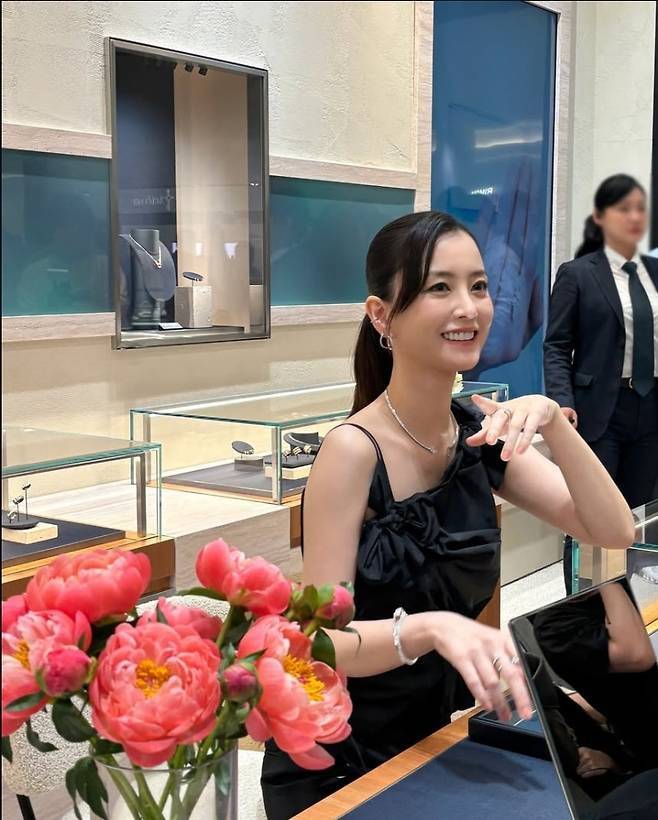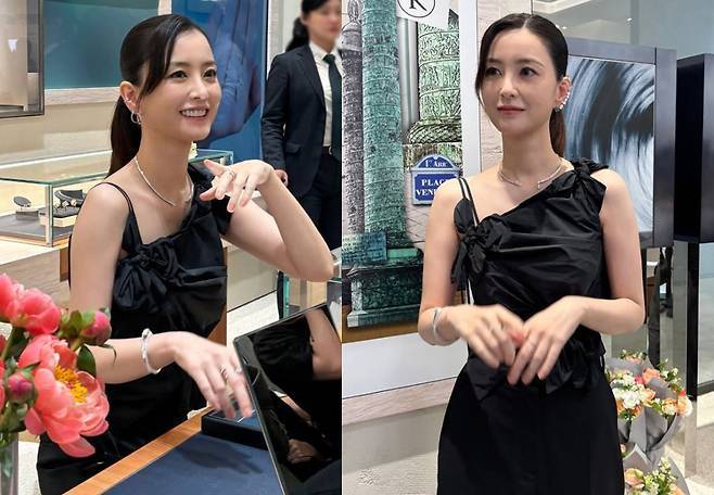 정유미는 비대칭 원숄더 디자인의 블랙 드레스를 선택해 독보적인 분위기를 완성했습니다.