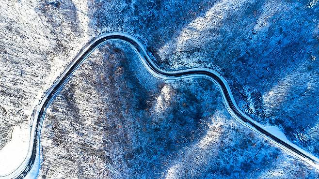 설경 속을 걷는 동안 풍력단지의 거대한 날개, 눈 쌓인 산성, 폐교의 흔적이 하나의 서사처럼 이어진다.