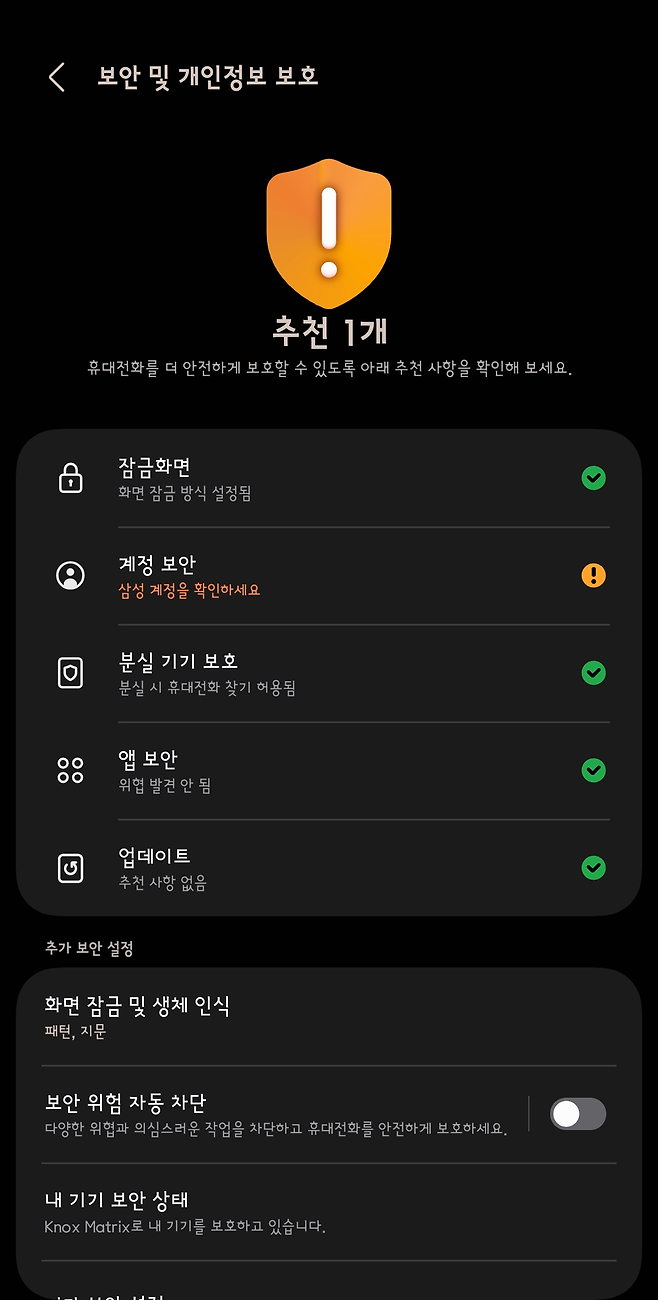 ‘보안 및 개인정보 보호’ 메뉴에서 ‘보안 위험 자동 차단’을 켜면 인증되지 않은 출처의 앱 설치, 악성 문자 링크, 의심스러운 파일 등을 자동 차단한다.