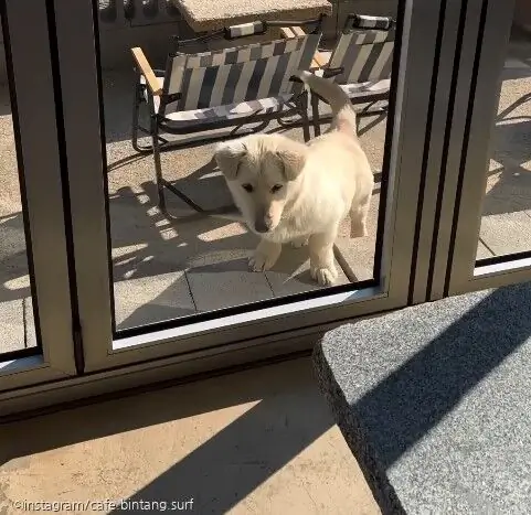 영상에 등장하는 수제비는 신나게 카페로 뛰어 들어오더니 손님이 앉아 있는 의자 밑에 들어가 장난을 치는 모습이다.