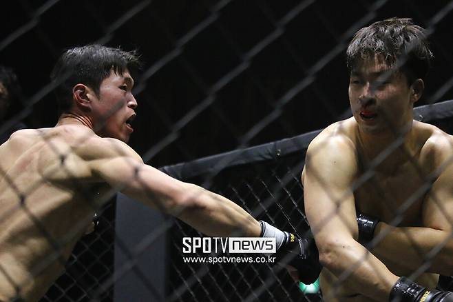2라운드 공기가 바뀌었다. 연속된 테이크다운 시도로 체력이 빠진 김연균의 스텝이 굳기 시작했다. 거리를 잡기 시작한 최준서의 잽과 이어진 오른손 펀치 연타가 불을 뿜었다.