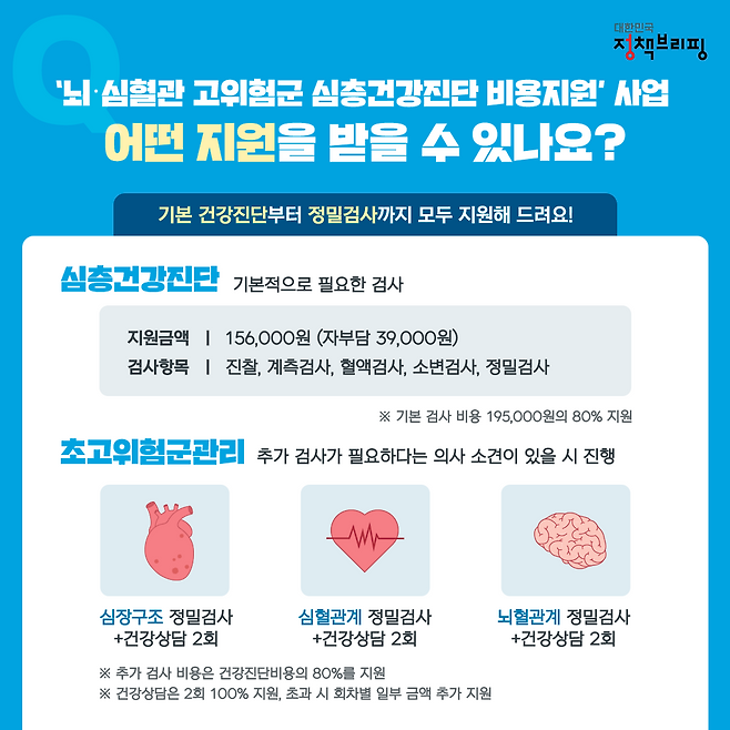 뇌·심혈관 질환 지원사업은 기본 건강 진단부터 정밀 검사에 이르기까지 폭넓은 지원을 제공합니다. 심층 건강 진단의 경우, 기본적으로 필요한 진찰, 계측검사, 혈액검사, 소변검사, 정밀검사 등을 포함하며, 이에 대한 지원금액은 156,000원입니다. 이는 기본 검사 비용 195,000원의 80%에 해당하며, 자부담은 39,000원입니다.