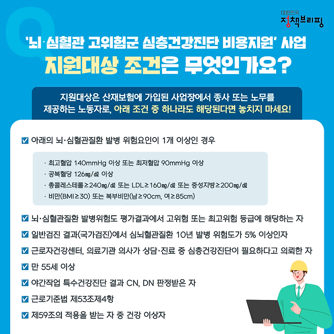 건강보험통계에 따르면 심장질환(2위), 뇌혈관질환(5위), 당뇨병(8위), 고혈압성 질환(9위) 등 심뇌혈관질환은 지난해 우리나라 주요 사망 원인 상위 10개 안에 들었습니다. 이에 안전보건공단은 경비원이나 택시·버스 운전기사, 택배기사처럼 야간작업이나 장시간 근무, 고령 등으로 뇌·심혈관 질환에 취약한 노동자들에게 심층건강진단 비용의 80%를 지원하는 사업을 진행하고 있습니다.