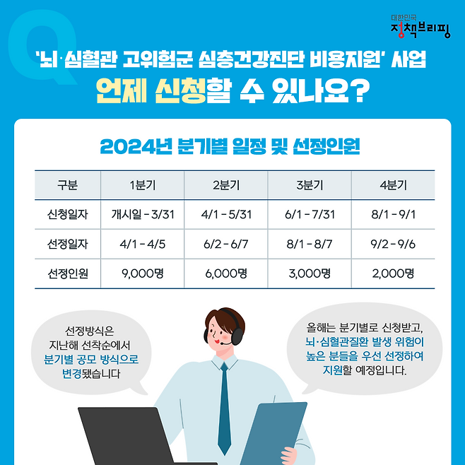 뇌심혈관질환 지원사업이 기존의 선착순 신청 방식에서 분기별 공모 방식으로 개편됐습니다. 이는 뇌심혈관 질환 발생 위험이 높은 사람들을 우선적으로 지원하기 위한 조치로, 심층 건강 진단을 통해 고위험군으로 판정되는 경우, 추가적인 정밀 검사와 건강 상담을 지원받을 수 있게 됩니다.