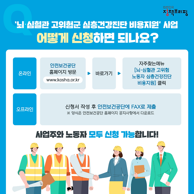 온라인과 오프라인으로 신청할 수 있는데, 온라인으로는 산업안전보건공단 홈페이지(https://www.kosha.or.kr)를 우선 방문합니다. 자주 찾는 메뉴에서 「뇌·심혈관 고위험 노동자 심층건강진단 비용지원」 클릭하여 신청할 수 있습니다. 오프라인으로는 산업안전보건공간 홈페이지 공지사항에서 신청양식을 다운 받아 작성한 후 안전보건공단 산업보건실 건강증진부(팩스) 052-702-9507에 팩스로 제출하시면 됩니다.