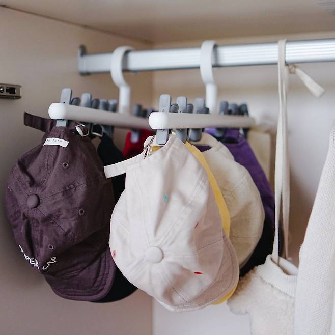 모자걸이는 캡이 있는 모자와 모양이 잡히지 않는 모자들을 수납하기 좋아요.