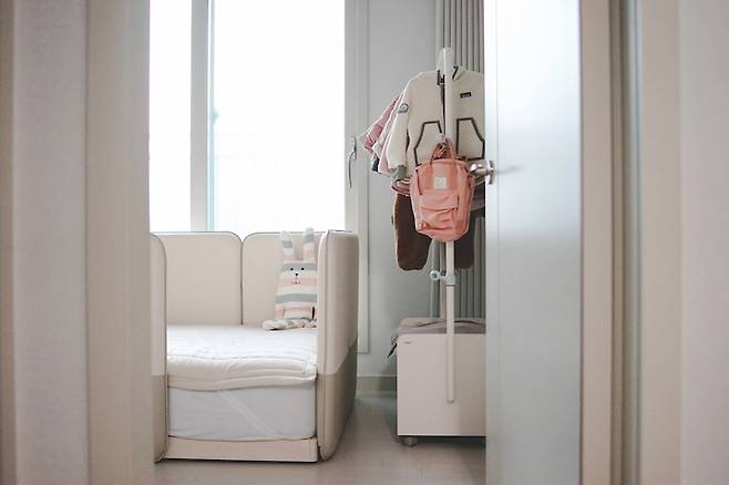 아이방은 심플하게 아이 침대와 옷장, 이동 행거로만 배치했어요. 아이방이 깔끔하게 유지될 수 있는 비결 아닌 비결이랍니다.