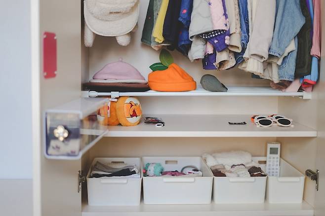 아직 아이 옷이 그다지 길지 않고 긴 외투는 행거에 걸어두다 보니 옷장 속 아래 공간이 아까웠어요.