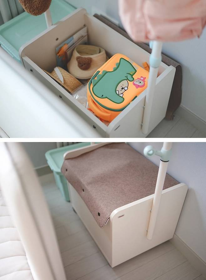 아이방에 이용하고 있는 이동 행거는 일룸 링키플러스입니다. 하단 수납공간이 넉넉해서 구겨지거나 부피가 커서 지저분할 수 있는 것들을 넣어두기 정말 좋아요.