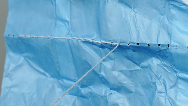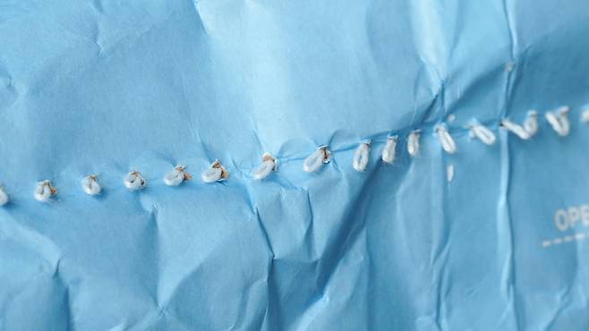 실을 끊을 땐 매듭과 매듭 사이를 잘라 주면 되는데요. 왼쪽 가장 끝 부분의 실을 잘라 준비하세요.