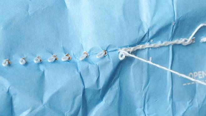 실을 끊을 땐 매듭과 매듭 사이를 잘라 주면 되는데요. 왼쪽 가장 끝 부분의 실을 잘라 준비하세요.