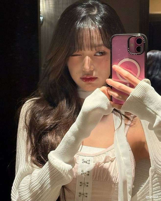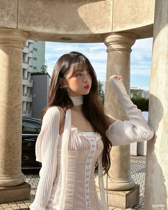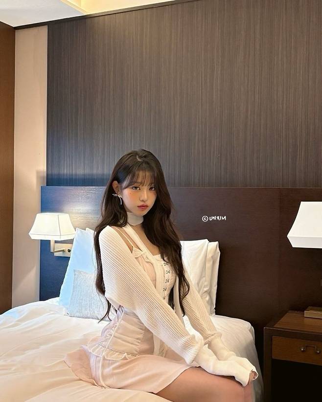 사진 속 그녀는 호텔 침대에 살포시 걸터앉아 정면을 응시하며 마치 구름 위에 앉은 듯한 몽환적인 포즈를 취하고 있습니다. 그녀가 착용한 연핑크 컬러의 미니 드레스는 보는 이들의 마음까지 부드럽게 만드는 힘을 가졌습니다. 특히 가로와 세로 방향으로 섬세하게 잡힌 셔링 디테일은 드레스에 입체감을 더하며, 움직일 때마다 사랑스러운 실루엣을 만들어냅니다. 앙증맞은 고양이 같은 포즈와 함께 어우러진 이 미니 원피스 코디는 그녀의 귀여운 볼살을 더욱 돋보이게 하며 ‘아직 아기아기하다’는 팬들의 반응을 이끌어냈습니다.