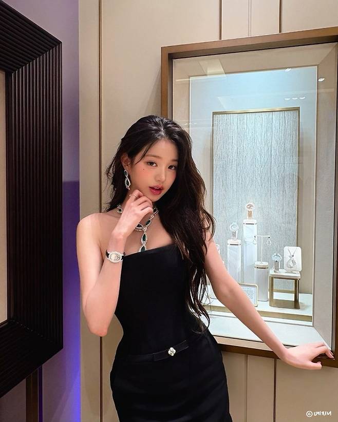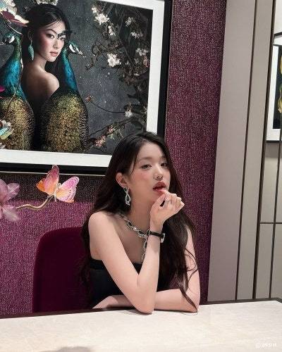 그녀는 군더더기 없이 깔끔하게 떨어지는 블랙 튜브탑 미니 드레스를 완벽하게 소화했습니다. 이 드레스는 그녀의 장점인 직각 어깨와 아름다운 쇄골 라인을 그대로 드러내며 시선을 사로잡았습니다. 특히 허리 라인은 잘록하게 잡아주면서 골반으로 이어지는 라인은 부드럽게 퍼지는 매혹적인 머메이드핏으로, 그녀의 비현실적인 몸매를 더욱 강조해주었습니다. 앞서 보여준 발레코어룩의 소녀 같은 모습과는 완전히 다른, 성숙하고 우아한 워뇨의 새로운 매력을 발견하게 된 순간이었죠.
