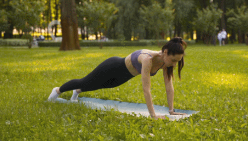 매트에 엎드려 플랭크 자세를 만듭니다. 오른쪽 무릎을 상체 방향으로 당겼다가 원래 자세로 돌아갑니다. 이어서 왼쪽 무릎을 상체로 당겼다가 원래 자세로 돌아갑니다. 이 동작을 반복합니다.