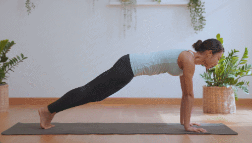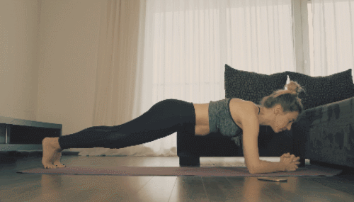 매트에 엎드려서 팔꿈치 플랭크 자세를 만듭니다. 오른쪽 팔꿈치를 펴서 오른쪽 손으로 바닥을 지탱합니다. 이어서 왼쪽 팔꿈치도 펴서 왼쪽 손으로 바닥을 지탱하며 플랭크 자세로 올라옵니다. 다시 팔꿈치를 차례로 구부려서 팔꿈치 플랭크 자세로 돌아옵니다. 이 동작을 반복하세요.