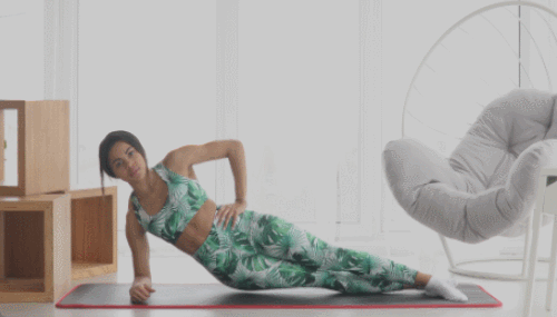 매트에 오른쪽 팔뚝을 대고 옆으로 누워서 시작합니다. 엉덩이를 들어 올려 몸이 발끝부터 머리까지 일직선이 되도록 합니다. 이 자세가 사이드 팔꿈치 플랭크 자세입니다. 엉덩이를 내렸다가 다시 들어 올리는 동작을 반복합니다. 반대편으로 자세를 바꿔 같은 동작을 진행하세요.
