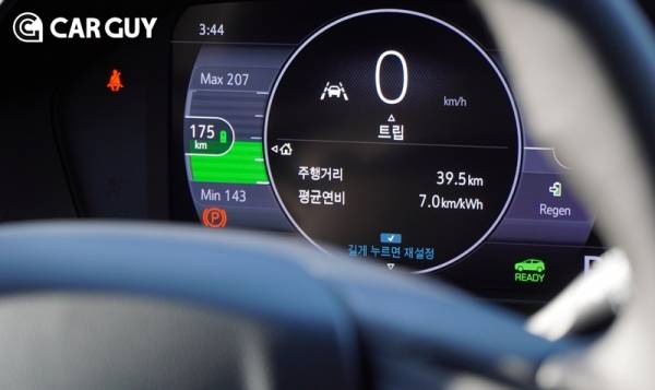 주행거리는 꽤나 만족스럽다. 66kWh 용량의 배터리를 탑재해 1회 완전 충전으로 403km를 주행 할 수 있다. 히트펌프가 빠져 있어 상온 주행거리 대비 저온 주행거리가 짧다. 다만, 실주행에서는 크게 문제가 되지 않는다. 150km를 주행하며 계기반에 나타난 평균 전비는 무려 7.3km/kWh, 공인 전비인 5.5km/kWh보다 월등히 높다. 높은 전비를 기록할 수 있었던 이유는 가속페달만으로 가감속이 가능한 원페달 드라이빙을 지원하기 때문이다. 외기가 10도 안팎일 때 100% 충전을 하면 계기반에 500km 이상 주행이 가능하다고 표시된다.
