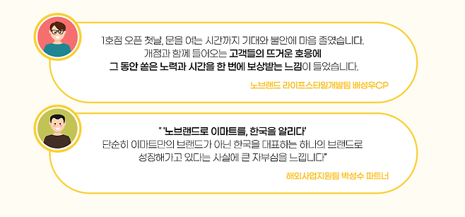 1호점 용인보라점에서는 상품 수를 대폭 확대해 총 1,200여 종을 선보였다. 상품의 90%를 노브랜드로 구성한 만큼, 기존에는 이마트 곳곳에 진열됐던 노브랜드 제품을 한데 모았다는 점만으로 고객의 호기심을 자극했다. 노브랜드는 현재 전국 260여 곳의 매장을 운영하며 매년 꾸준한 매출 성장세를 보이고 있다.