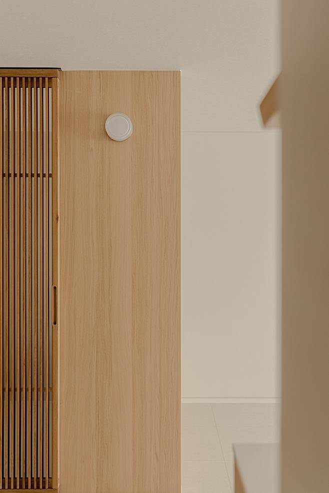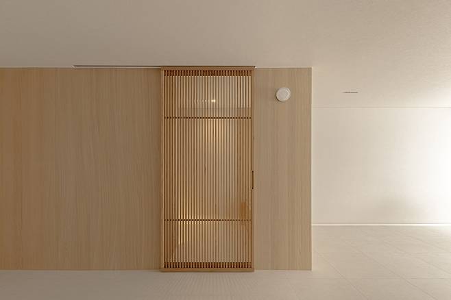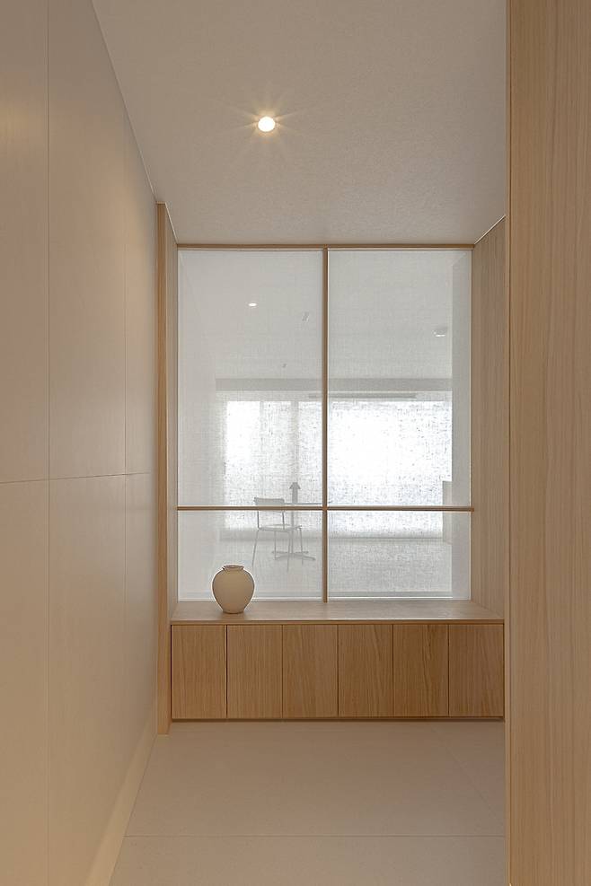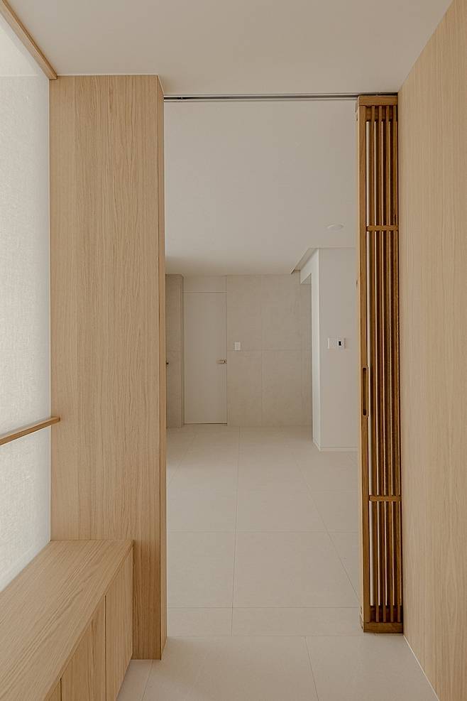 특히나 중문을 설치하되 꼭 간살 중문으로 하고 싶다라는 니즈만 있었는데, 중문을 현관문과 나란한 방향으로 단순히 설치하는 것이 아니라 ㄱ자로 한번 꺾어서 프라이버시도 확실히 지키면서 간살 중문을 슬라이딩 형태로 만들 수 있는, 기능과 미적 요소를 동시에 갖춘 아름다운 현관으로 재탄생시켜 주셨어요.