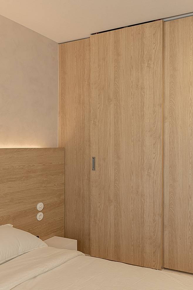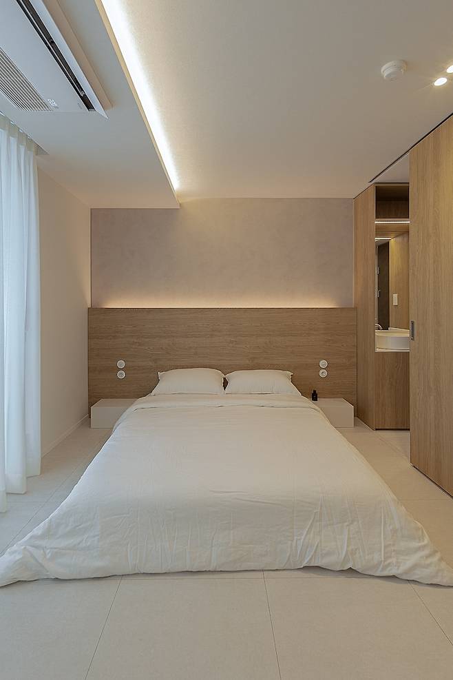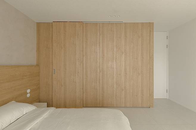 집 전체적인 무드에 맞춰 원목으로 붙박이장을 짜 넣었고, 방 자체가 크지 않아 침대 헤드도 붙박이장과 동일한 원목으로 제작하여 통일감을 주고자 했습니다.