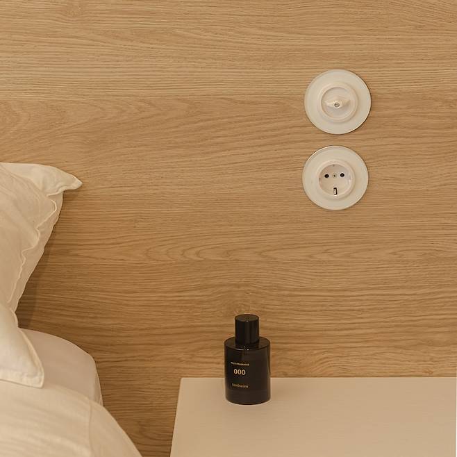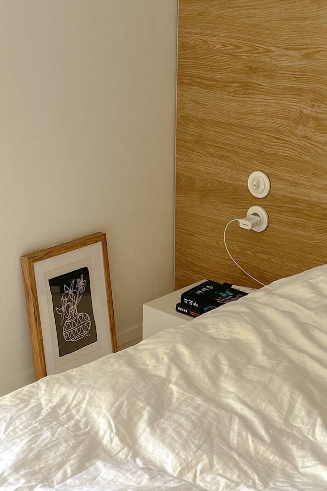 그리고 침대 헤드에 콘센트가 있는 것이 편리성에 있어서 너무 좋은데, 콘센트를 일반적인 것이 아닌 바우하우스 테크노 라인의 콘센트와 조명 스위치를 같이 배치해서 깔끔하면서도 너무 아름다운 포인트가 되었습니다.