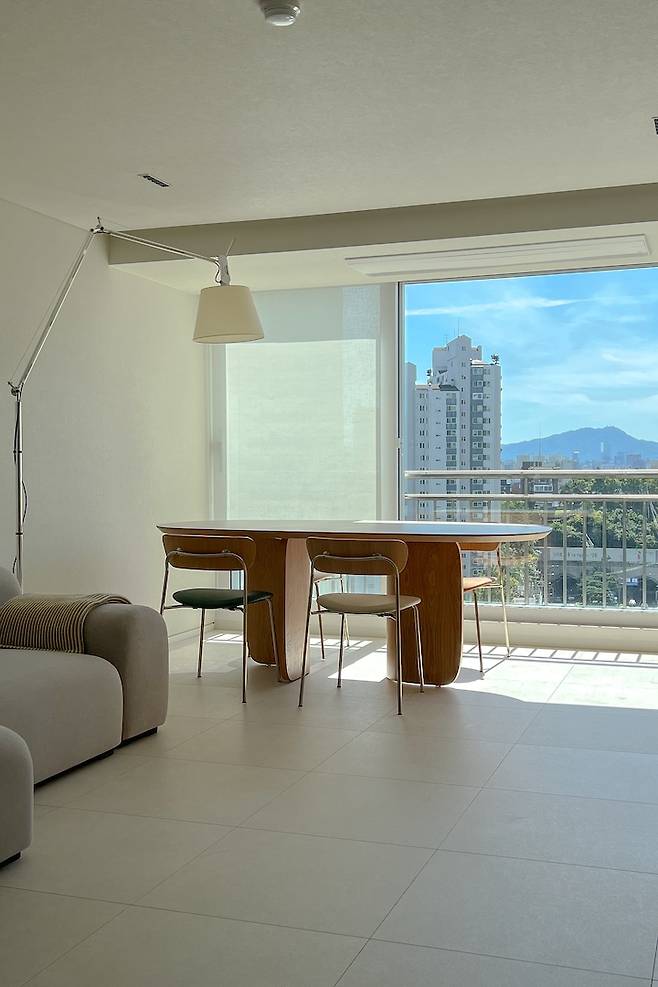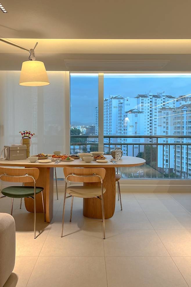 거실을 가족이 함께하는 공간으로 만들기 위해 다이닝 테이블을 크게 벽쪽으로 두고 싶었는데요. 무엇보다도 거실과 잘 어울리는 테이블을 찾는 것이 관건이었어요.