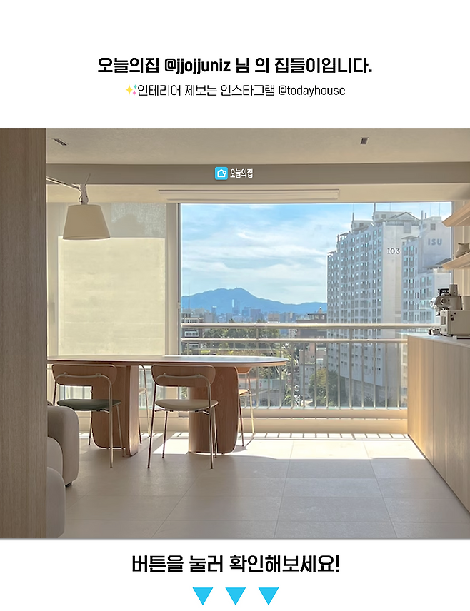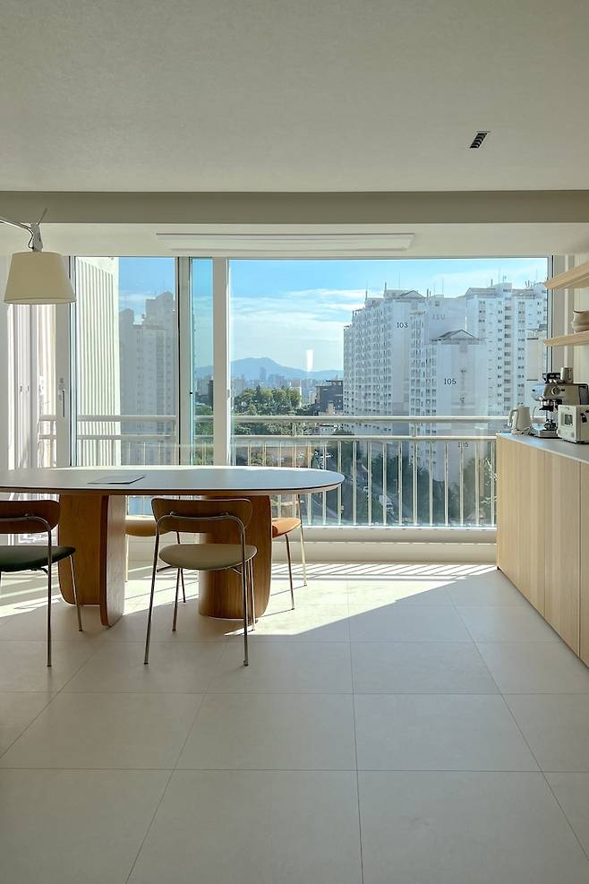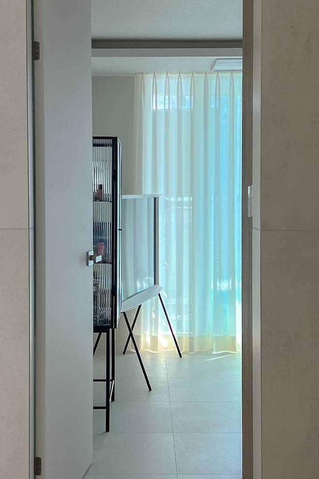 맑은 날 바라보는 뷰는 정말 최고입니다. 파란 하늘이 마음을 뻥 뚫어주는 듯한 뷰가 너무 만족스러워요. 이번에는 넓은 창을 마음껏 만끽해 보고자 하는 마음에, 패브릭의 암막 커튼을 달지 않고, 저희 집 분위기와 찰떡인 린넨 재질처럼 보이는 아이보리색 버티칼을 설치했습니다.