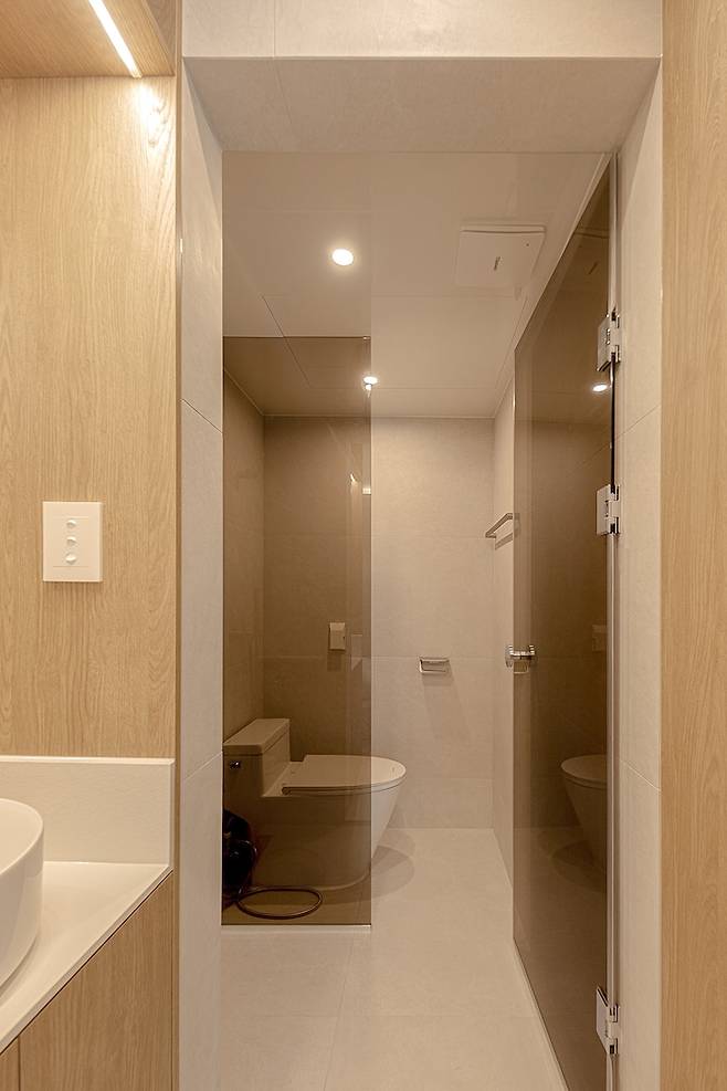 드르륵- 슬라이딩 도어를 열면 화장실이 등장합니다. 기존에 안방 화장실 자체가 너무 작았기 때문에, 세면대와 샤워기는 동시에 둘 수 없다는 아쉬운 점이 있었는데요.
