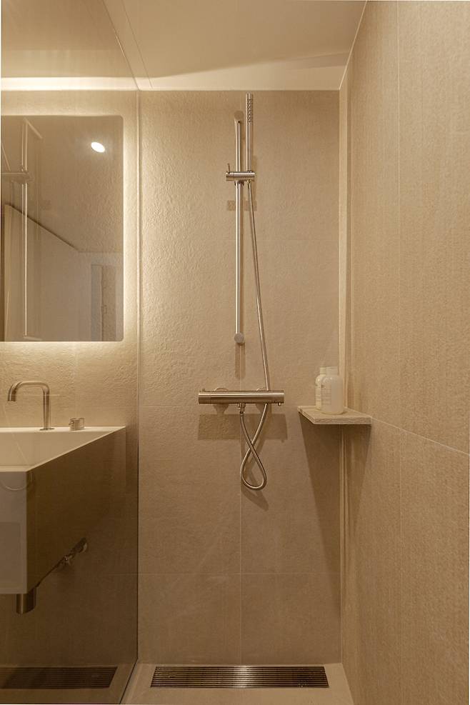 정갈함을 유지하기 위해서 간단하게 샤워 도구를 올려놓을 수 있는 것을 만들었는데, 욕실의 타일과 동일한 타일이어서 이질감 하나 없이 너무 깔끔하고 마음에 드는 포인트 입니다.