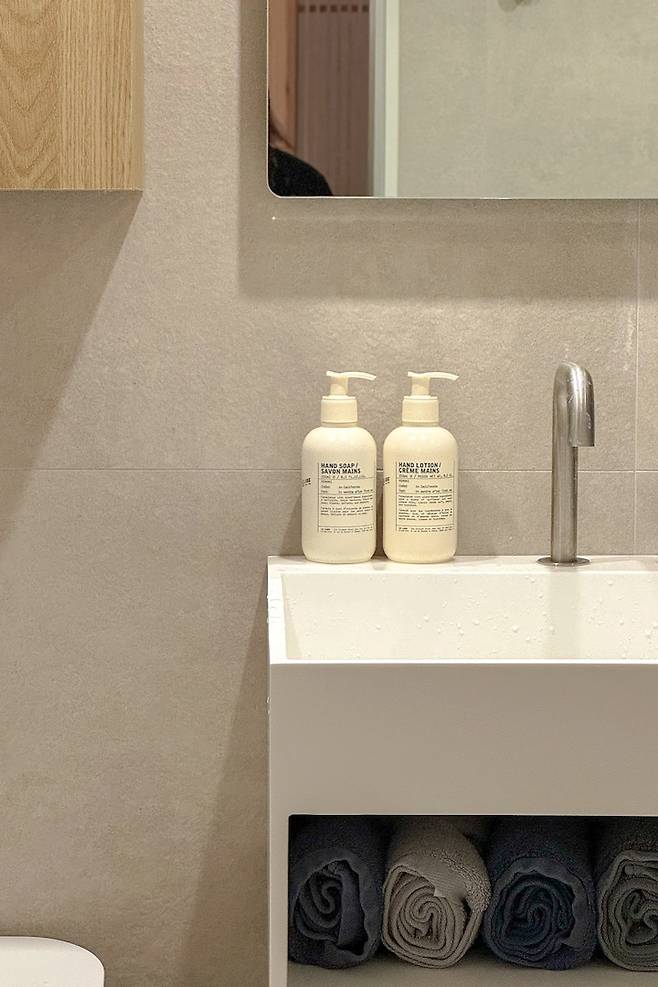 너무 예쁜 질감과 톤을 가진 화장실의 타일, 만족도 최상입니다! 세면대 아래에 수건이나 소품을 넣을 수 있는 공간이 마련된 세면대로 선택했습니다. 수건을 바로바로 꺼내기 너무 편한 것 같아요.