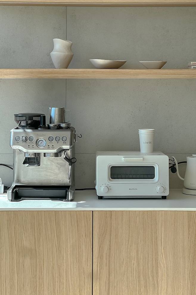 바닥에 휑하게 있는 보일러 분배기를 가리기 위한 해결책으로 긴 거실장을 직접 짜서 넣었는데, 결론적으로 수납공간도 엄청 많이 확보하고, 홈카 페처럼 커피머신기를 놓을 수 있는 좋은 공간으로 완성된 것 같아 만족스럽습니다.