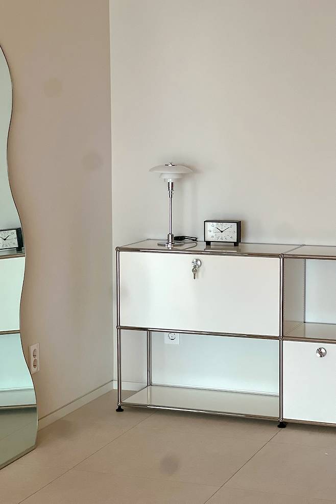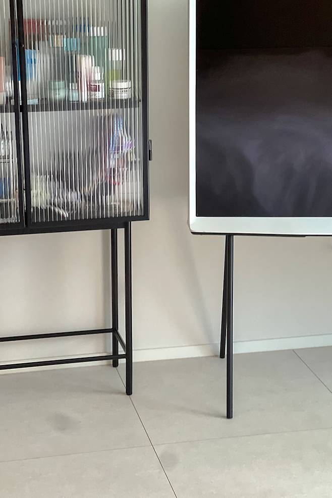 TV 스탠드와 같은 재질과 색상의 사이드 보드를 나란히 배치하였고, 화장대가 없는 저희 집에 키가 큰 사이드 보드는 화장대의 역할과 함께 수납장의 역할을 동시에 해주고 있습니다. 원목과 화이트에 검정색의 스탠 재질 다리가 잘 어울릴지 우려했던 것과는 달리 포인트로 딱인 것 같아 만족스럽습니다.