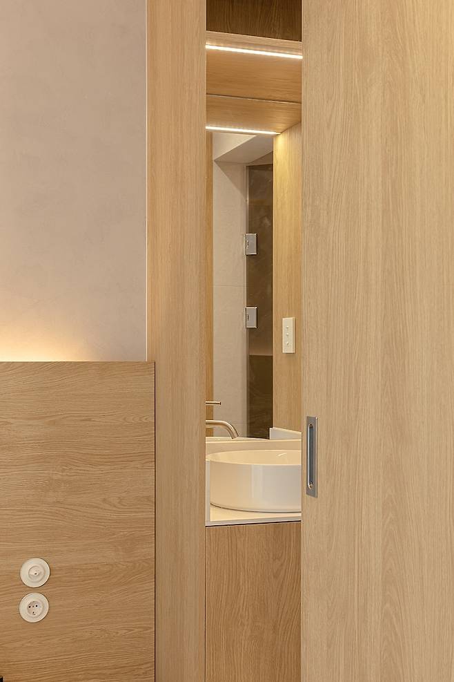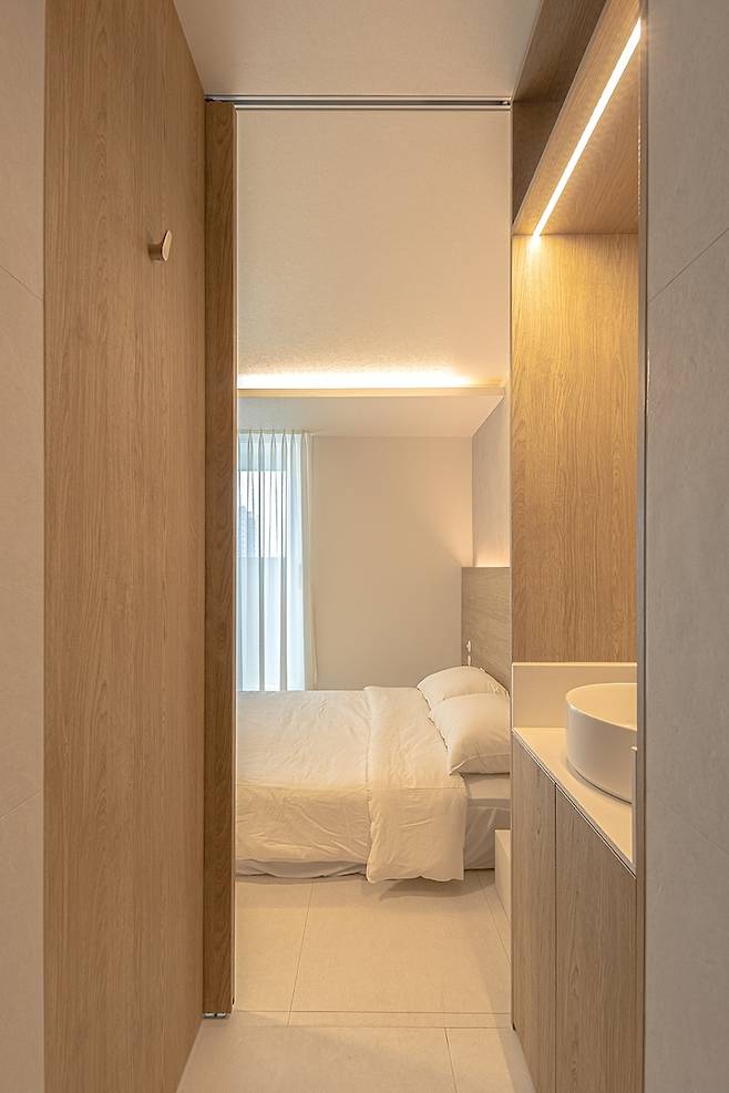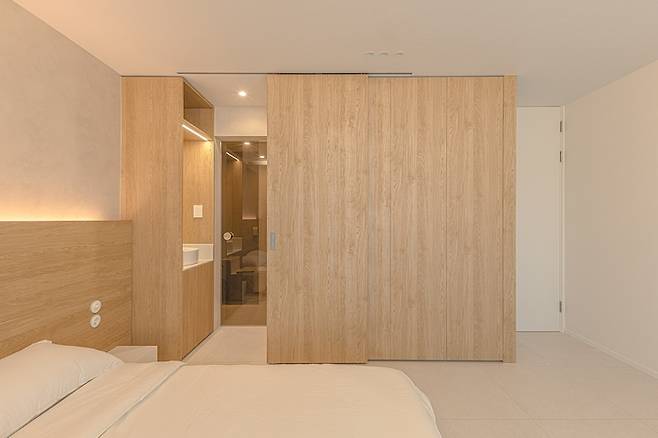 다음으로 소개해 드릴 공간은 안방의 화장실입니다. 크지 않은 안방에 화장실은 어디 숨어있을까요? 보이시는 것과 같이 따뜻함이 가득한 원목 슬라이딩 도어 뒤에 있는데요,