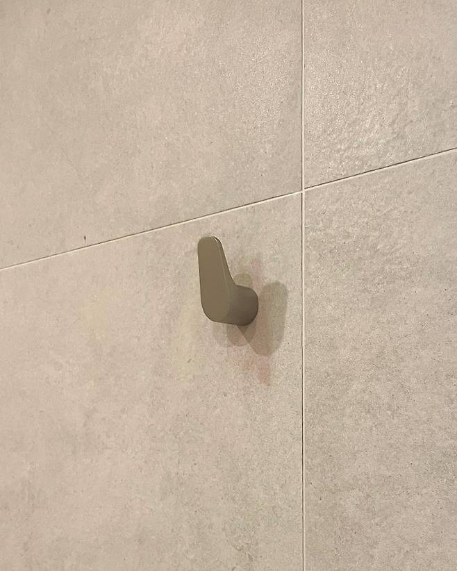 거실 화장실도 큰 편이 아니다 보니, 수건걸이를 길게 벽면에 설치하게 되면 가림막을 벗어나는 위치까지 와야 벽면의 센터가 유지된다고 해서 수건걸이를 귀엽게 작은 것으로 선택했습니다. 화장실의 타일이 주는 분위기 자체로 너무 만족스러웠기 때문에 수건걸이를 포인트처럼 작은 옷걸이 형태로 둔 것도 마음에 들었어요.