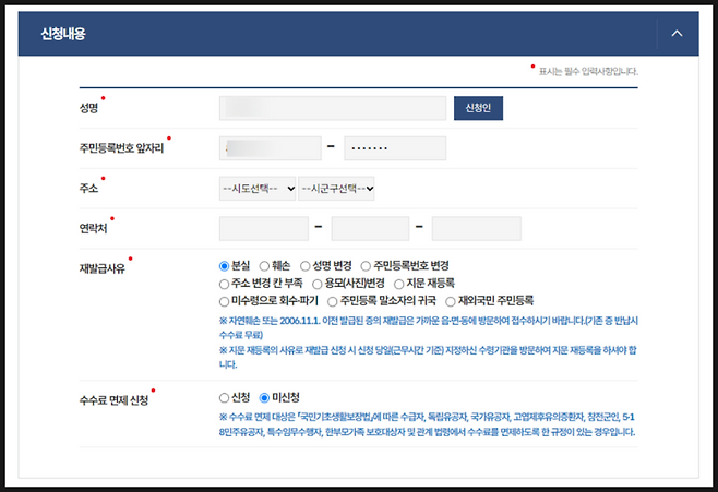 성명, 주민등록번호, 주소, 연락처, 재발급사유, 수수료 면제 신청을 확인후 기입해주면 됩니다.