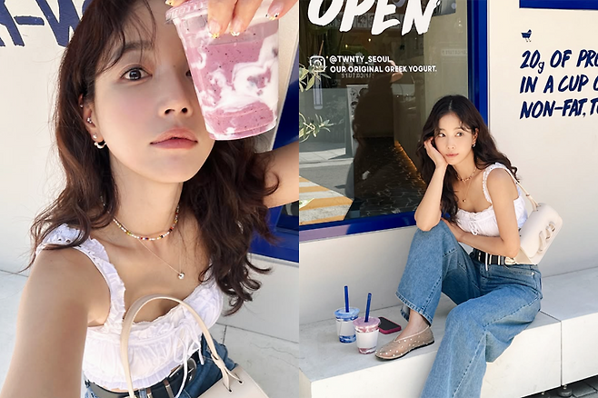 기은세는 어깨 끈이 포인트인 화이트 슬리브리스 톱과 같은 톤의 팬츠를 매치하며 전체적인 톤온톤 룩을 연출했다.