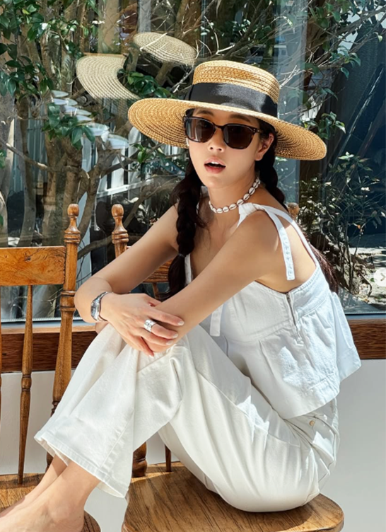 여기에 라탄 소재의 넓은 챙 모자와 블랙 리본 포인트가 더해져 고급스러운 바캉스 무드를 완성했다.