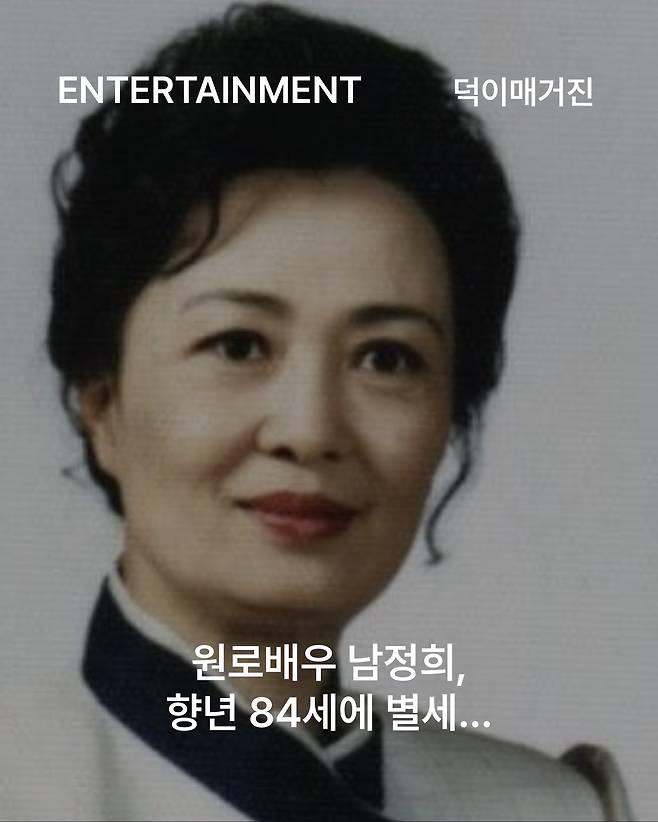 원로배우 남정희가 세상을 떠났습니다. 향년 84세입니다. 원로영화인회와 유족 등에 따르면 남정희는 지난 22일 자택에서 세상을 떠났습니다. 고인은 1년 전 척추 수술 후 건강이 악화된 것으로 알려졌습니다.