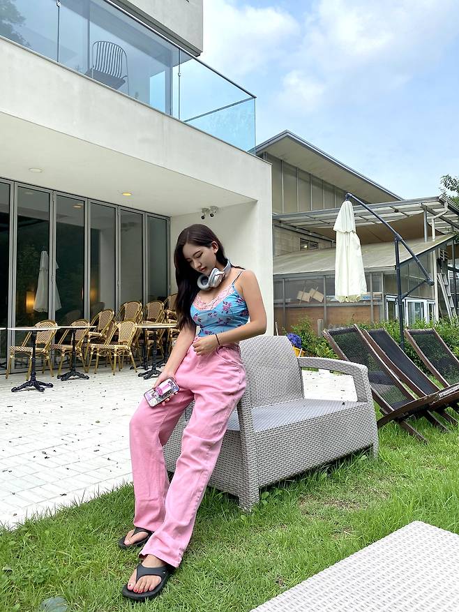 분홍색 꽃무늬가 들어간 크롭기장 나시와 핑크 와이드 팬츠