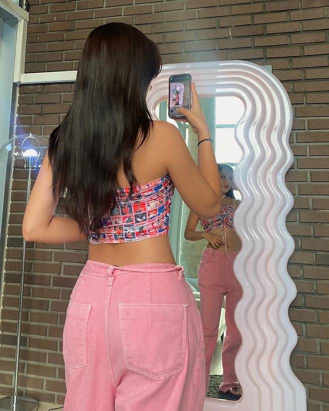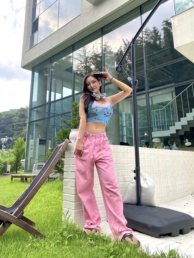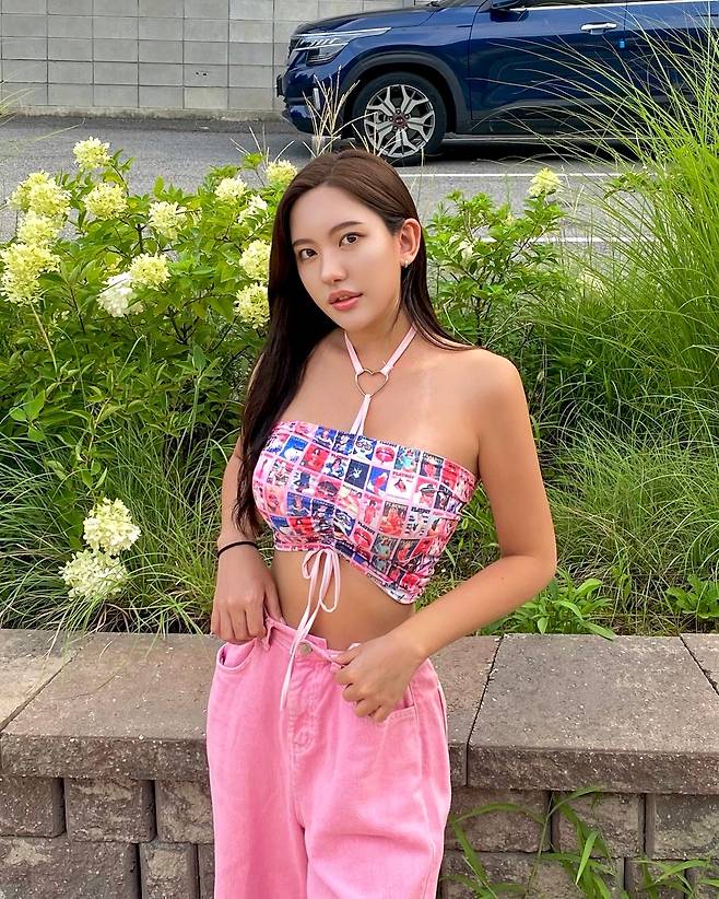 하늘색 크롭티에 분홍 레이스과 분홍빛 꽃무늬가