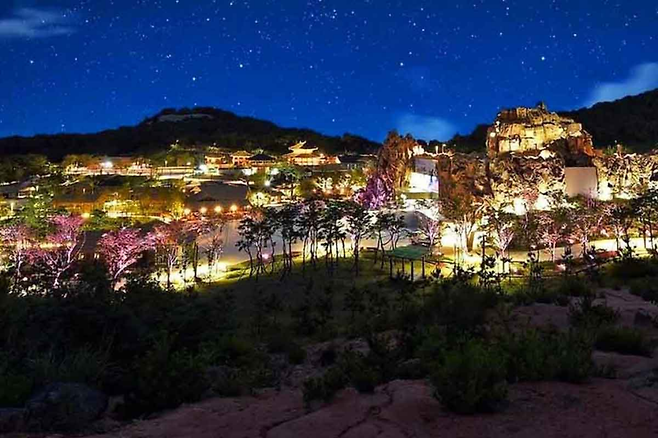 김해가야테마파크의 빛 축제는 ‘빛의왕국 가야’라는 이름으로 열리며, 역사적인 건축물들을 화려한 조명으로 물들여 새로운 모습으로 재탄생시켰어요. 총 3억 5,000만 원을 들여 테마파크 곳곳에 설치한 조명들이 마치 다른 세상에 온 듯한 느낌을 준답니다.