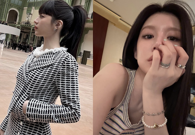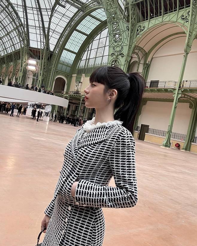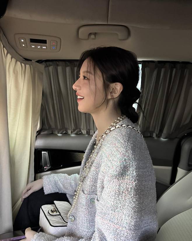 사진 속 고윤정은 청바지에 샤넬 트위드자켓과 샤넬백을 들고 우아한 멋을 뽐내고 있습니다.