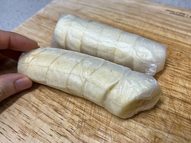 바나나는 한 번 먹을 양만큼 랩에 따로 싸세요. 이렇게 하면 필요한 만큼만 쉽게 꺼내 쓸 수 있고 냉동 중에도 서로 들러붙지 않기 때문입니다.