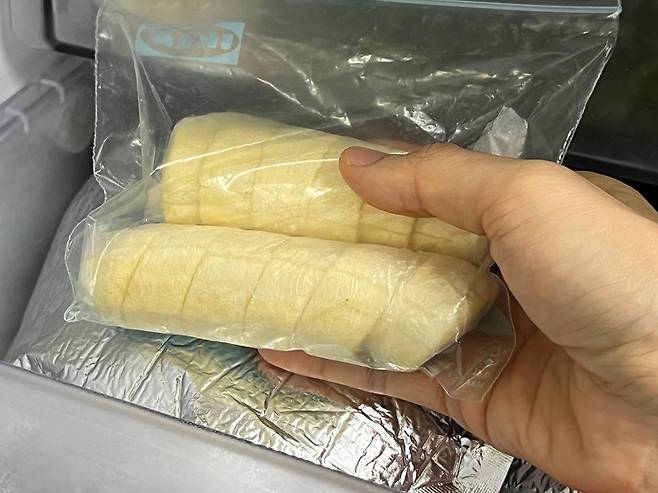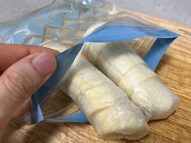 랩으로 감싼 바나나는 다시 지퍼백에 넣어 이중으로 밀봉합니다. 이렇게 하면 냉동실 냄새가 배는 것을 막아주고, 수분 증발이 방지하여 바나나 고유의 맛을 그대로 잘 유지할 수 있습니다.